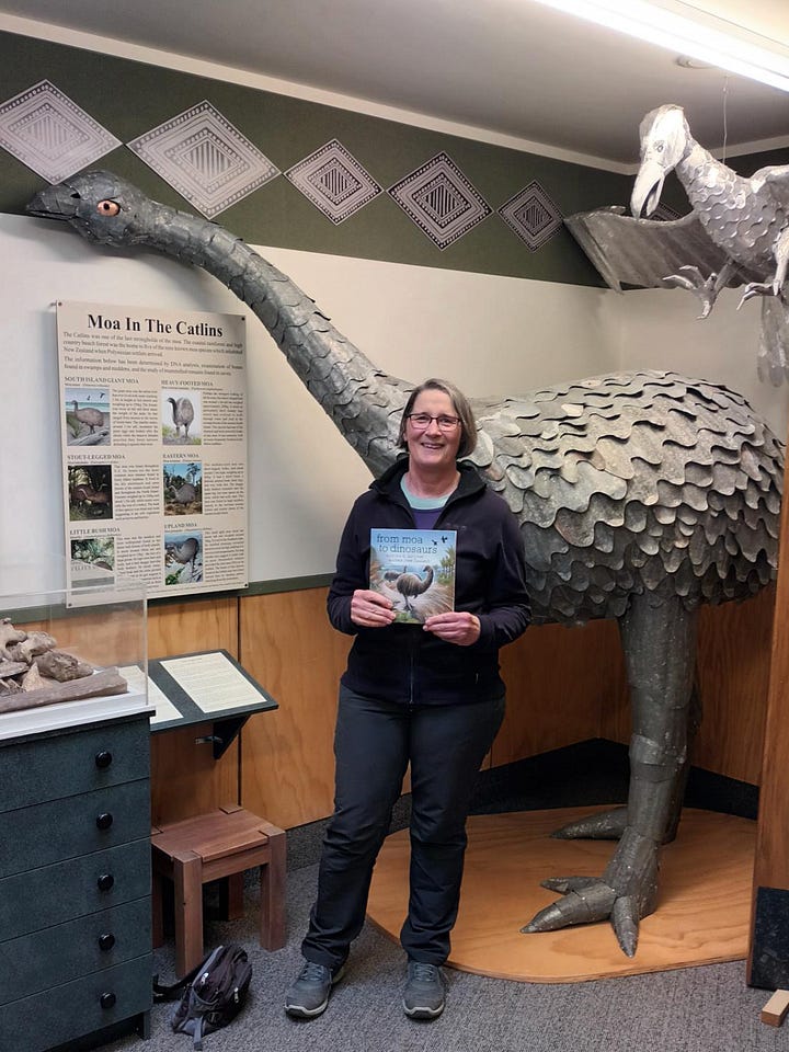 My books pop up in the most interesting places. I was delighted to discover a wonderful museum in Owaka with From Moa to Dinosaurs among their selection of books for sale. Introducing myself as the author led to a photo shoot in the Lockerbie Room and an opportunity to look through their fantastic collection of moa artefacts.